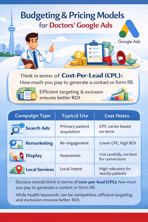 Doctors should think in terms of cost‑per‑lead (CPL): how much you pay to generate a contact or form fill. While health keywords can be competitive, efficient targeting and exclusion ensures better ROI.